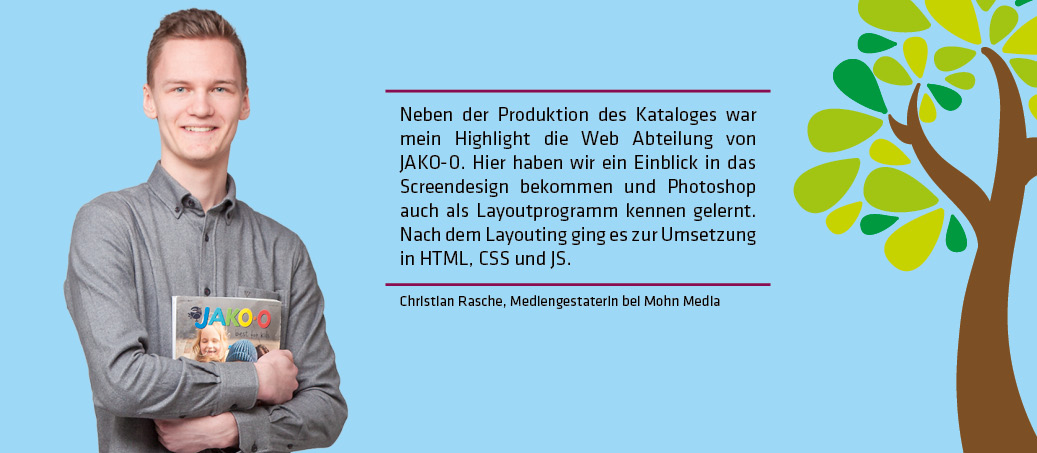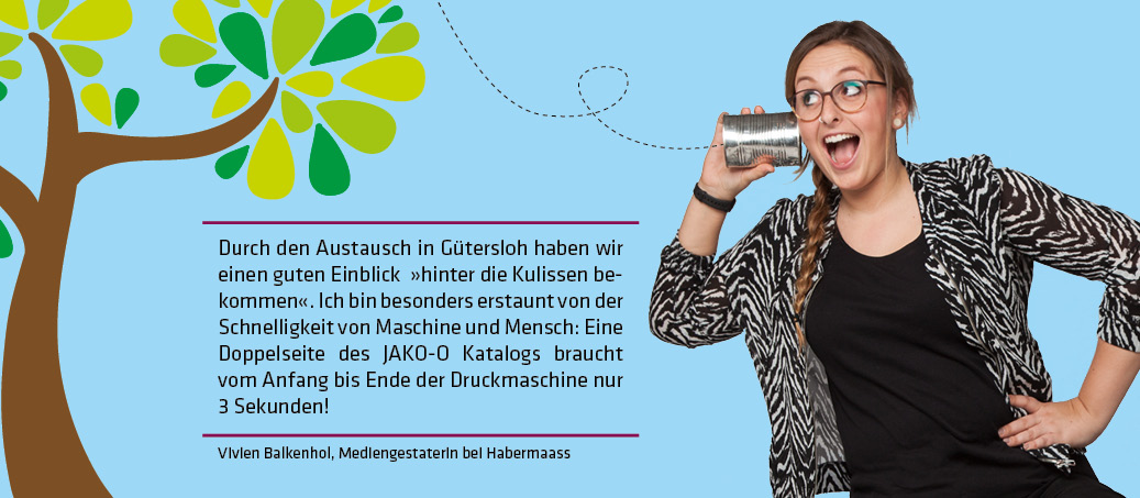 Wir und auch schon einige Jahrgänge vor uns hatten die Chance auf diesen Austausch, weil JAKO-O seine Kataloge bei Mohn Media drucken lässt. Dabei findet der Aufbau und die Gestaltung bei Habermaass direkt statt und in Gütersloh werden die fertigen Daten nur noch kontrolliert und gedruckt.