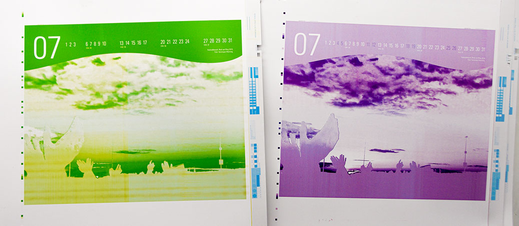 Neben der finalen Bearbeitung des Layouts mussten natürlich noch die Bilder bearbeitet und passende Bildunterschriften gefunden werden. Bei der Bearbeitung bekam ich Hilfe von meinem Ausbilder – Kalender müssen nämlich »funktionieren«, denn einen ganzen Monat zeigen sie dasselbe Bild. Daher sollte dieses so spannend und auffällig wie möglich sein, ohne das Kalendarium in den Hintergrund zu stellen.